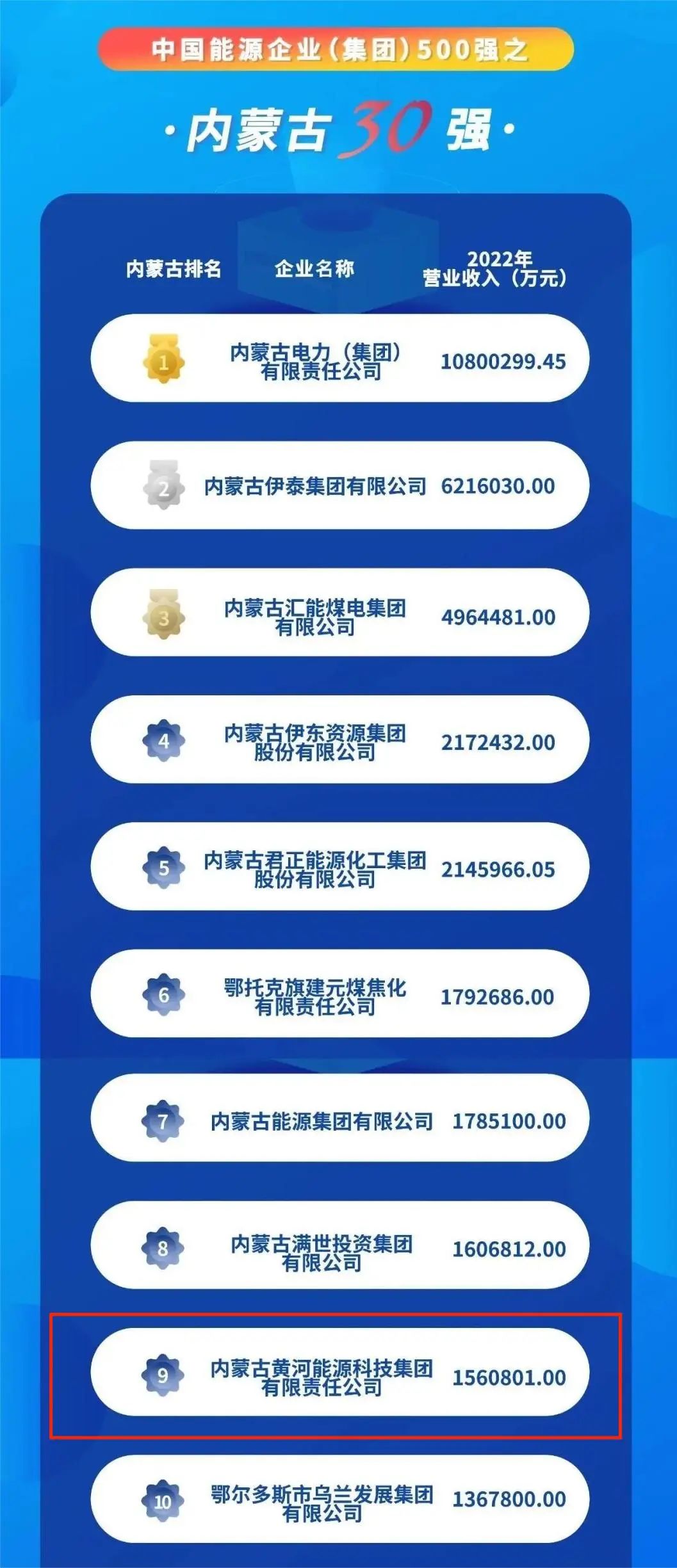 近日,中國能源報旗下中國能源經濟研究院公布2023中國能源企業(yè)(集團)500強榜單,內蒙古黃河能源科技集團位列榜單第219名;中國能源企業(yè)(集團)500強之內蒙古30強第9位。